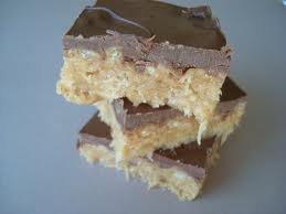 Topping-melt chips and spread on rice krispies mixture. Cut within 30 min