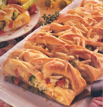 4) Unroll 1 package of crescent dough. Do not separate. Arrange longest sides of dough across width of 12" x 15" baking sheet. Repeat with remaining package of dough. Roll dough to edges of sheet, sealing perforations.