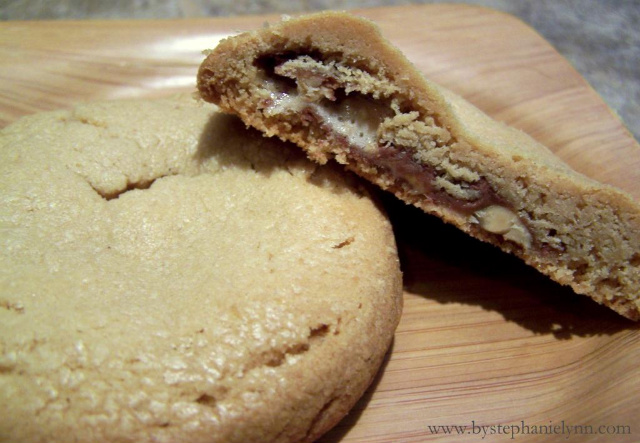 7) Scoop out a spoonful of dough, press it flat and place a mini snickers in the center.