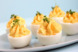 4) Put a mound of filling into each egg half. Right before serving, sprinkle the eggs halves with the smoked paprika and the parsley.