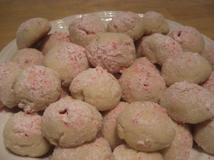 7) While still warm, roll cookies in leftover sugar/candy mixture. Let cool. Roll in mix again. Enjoy.