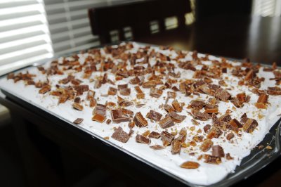 4) Spread the cool whip and then sprinkle with crushed Skor bar candy pieces.