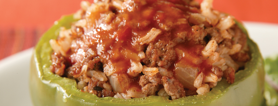 5) Stuff each pepper with meat mixture; stand upright in greased 8x8x12 baking dish