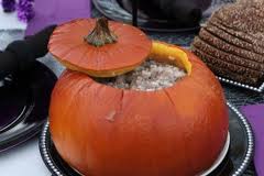6) Add cooked rice and water chestnuts. Spoon mixture into cleaned pumpkin shell. Replace pumpkin top and place entire pumpkin, with filling, on a baking sheet.